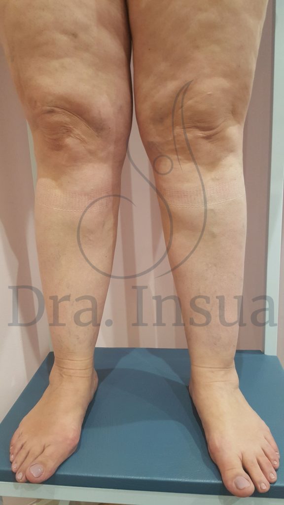 Paciente con lipedema y obesidad. Puede observarse la coexistencia de varices (enfermedad venosa crónica C2 con trayectos dilatados y tortuosos en muslo), valgo de rodilla e irregularidades de la peil en muslos para descartar celulitis o seudocelulitis.