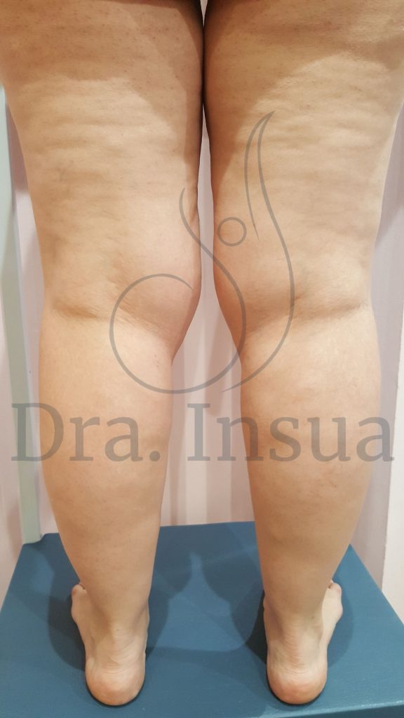 Lipedema en paciente con sobrepeso. Además, se observa : alteración del eje de las rodillas e irregularidades de la superficie cutánea en cara posterior de muslos ( posible celulitis o seudocelulitis asociada).